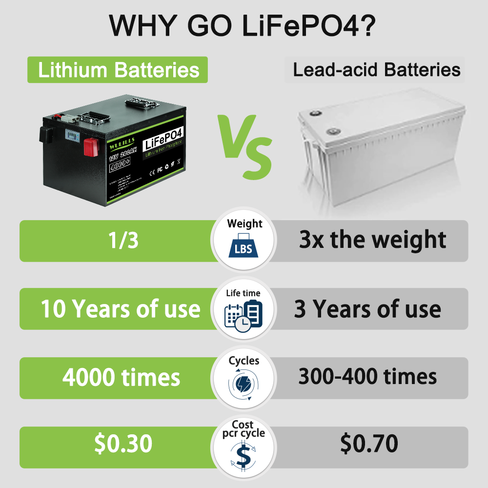 Our LiFePO4 battery has built-in BMS (Battery Management System) to protect it from overcharge, over-discharge, over-current, and short circuit with excellent self-discharge rate. Built-in high temp cut off prevents charging over 122 °F (50 °C). Plus, Li-Ion batteries can be safer than Lead Acid batteries, which have no protection against ground faults. This product fits for outdoor camping power and indoor easy installation.