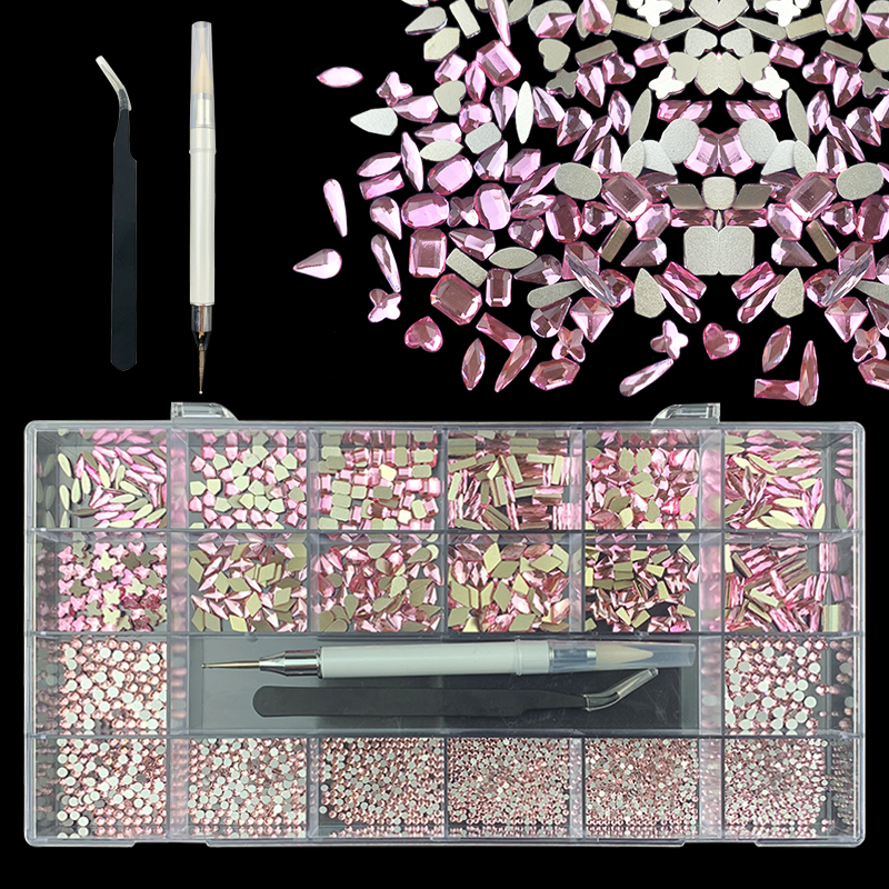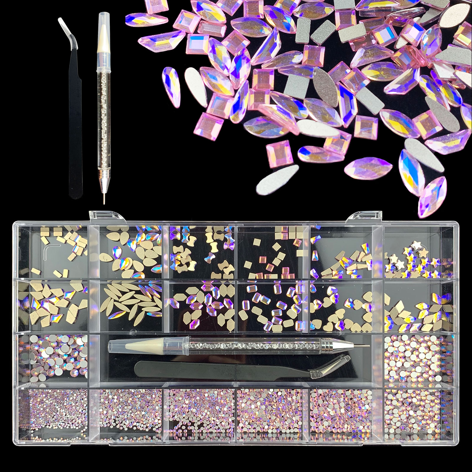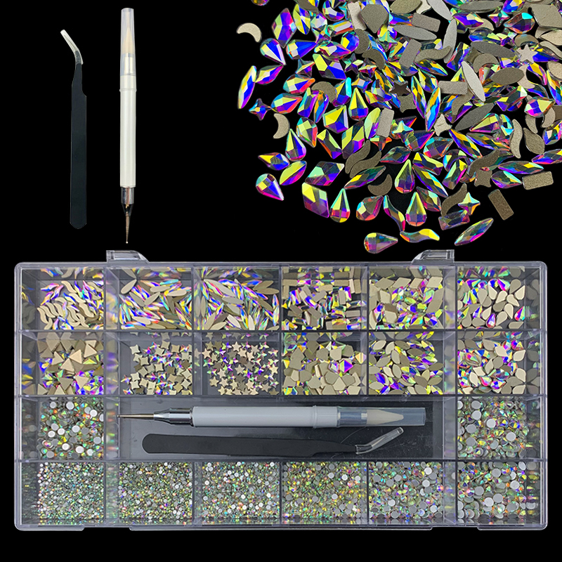 2). 2740pcs Rhinestone set: 240pcs(20x12) k9 crystal glass rhinestones, 2500pcs mix sizes round rhinestones,1pcs wax pen(Crystal or white), 1pcs tweezers for free