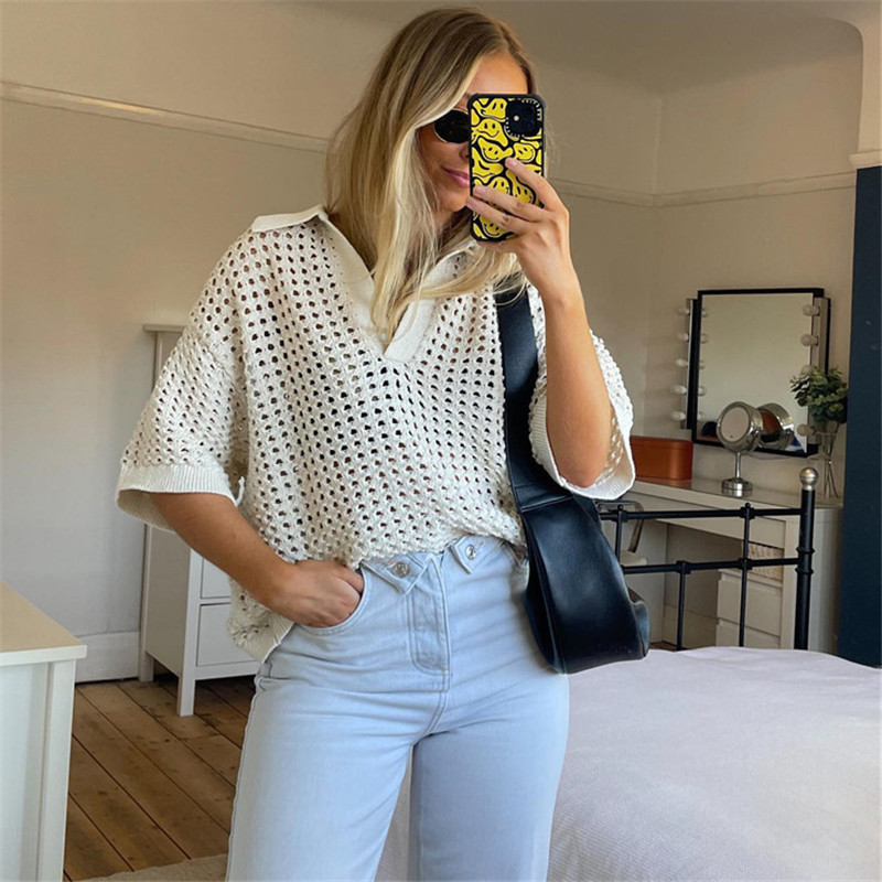 Basic Knitted Hollow Polo Women Short Sleeve Top Loose Casual Solid Color Polo Shirt Women Street Outfit Spring Summer 2022 シャツ