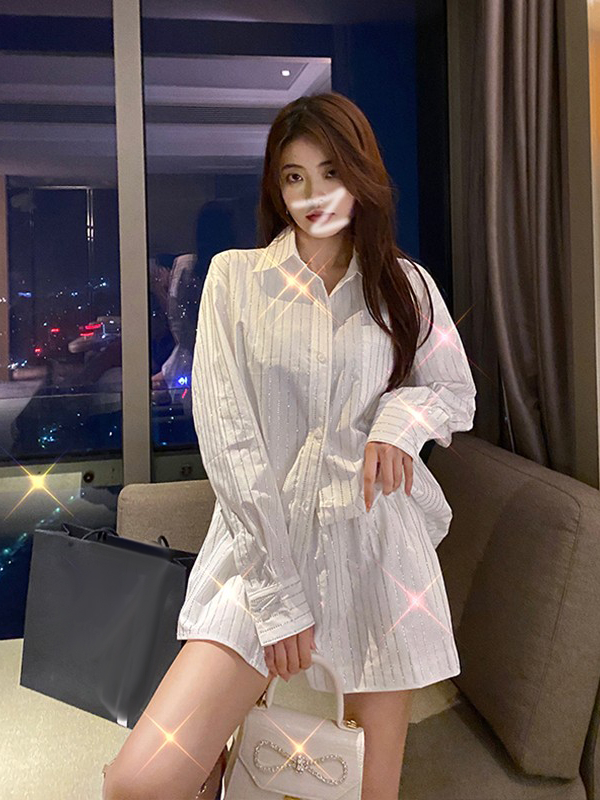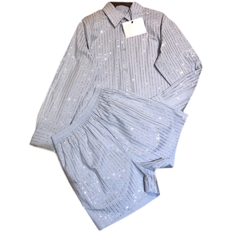 Design Drilling Striped Suit Spring Summer Casual Loose Long Sleeve Shirts Wide Leg Shorts Temperament 2pcs