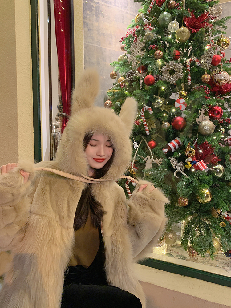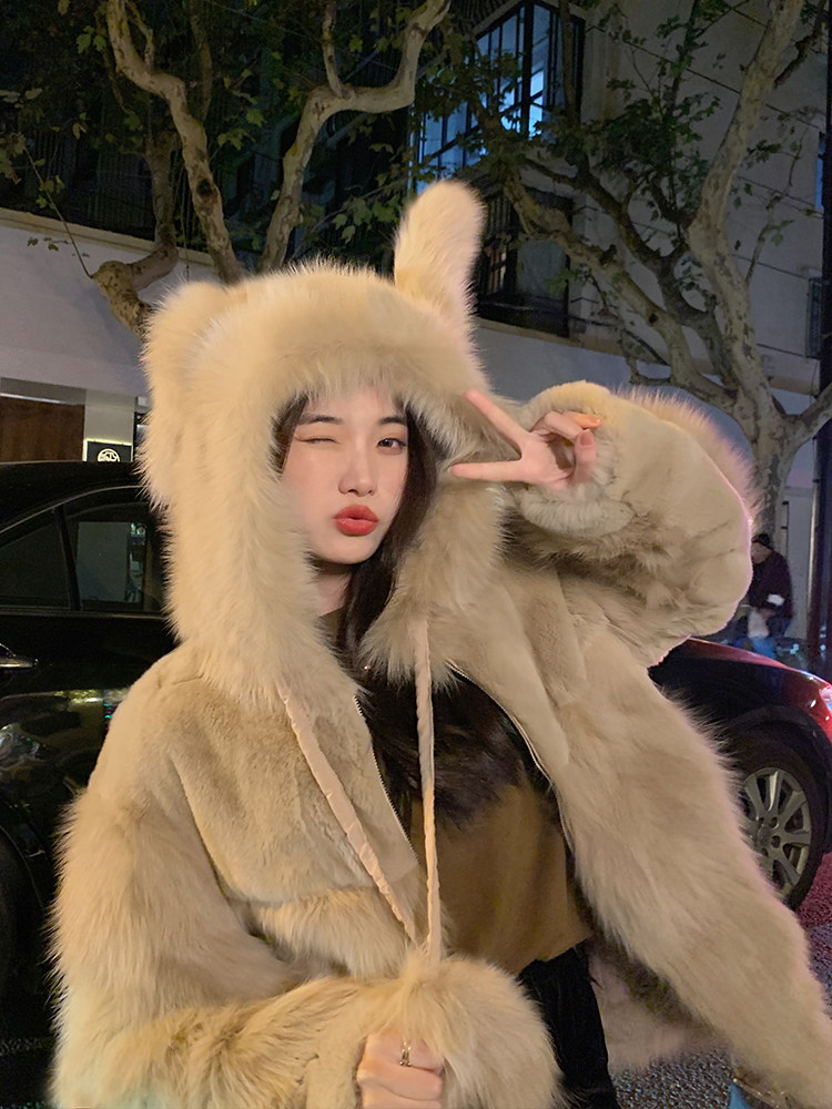 "Drunken Rabbit" imported fox fur splicing otter rabbit hood fur coat young winter girl