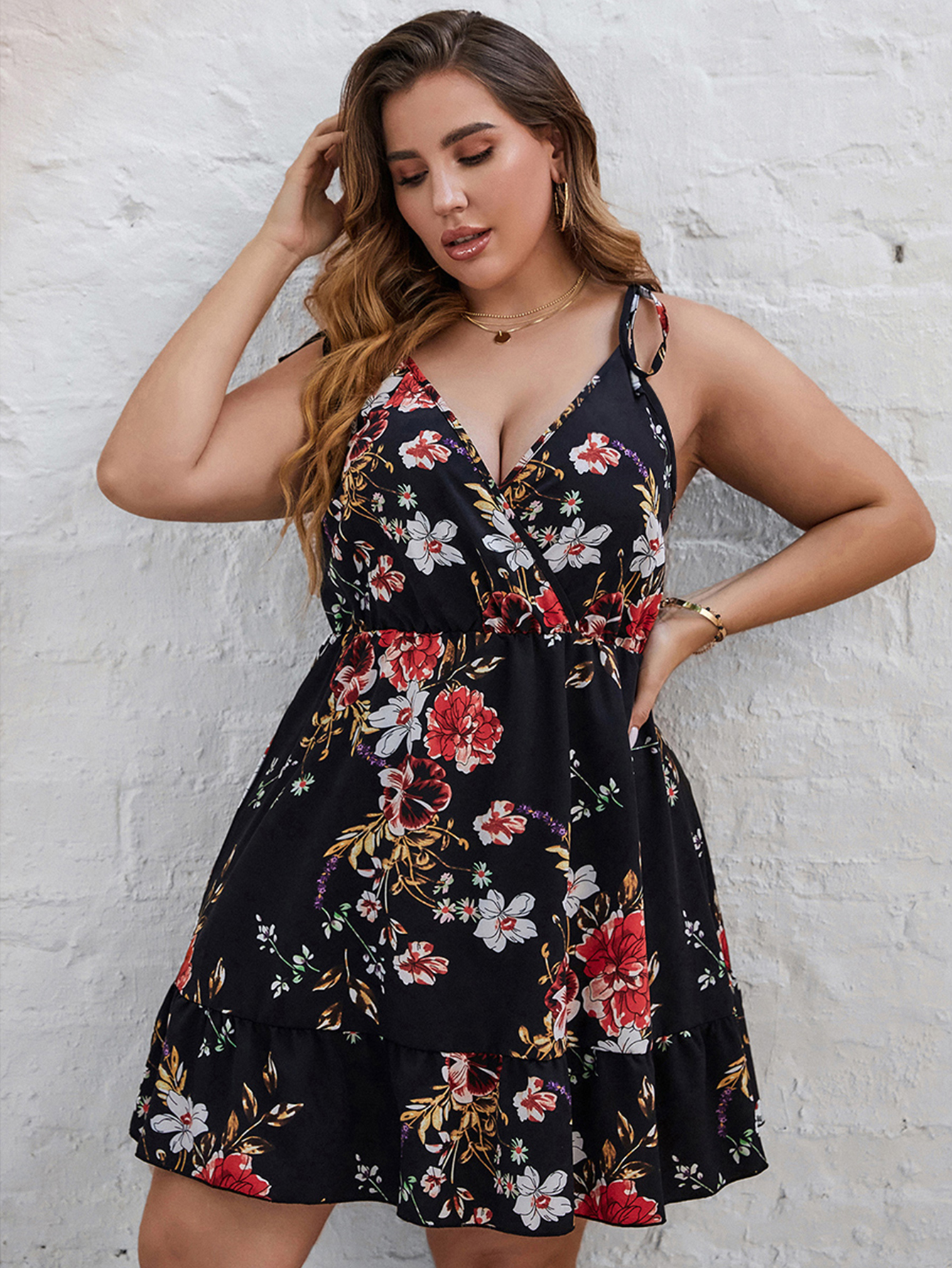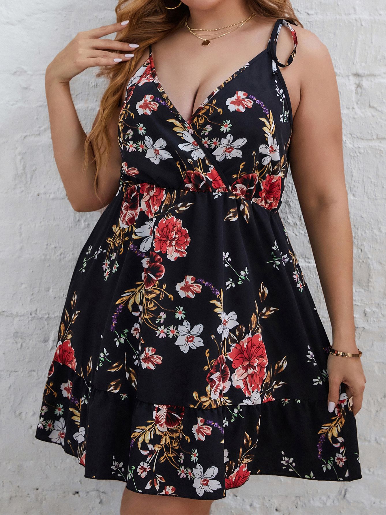 EARO Black A Line Dress Plus Size Floral Print Summer Sleeveless V Neck Sexy Elegant Spaghetti Strap Evening Party Dresses