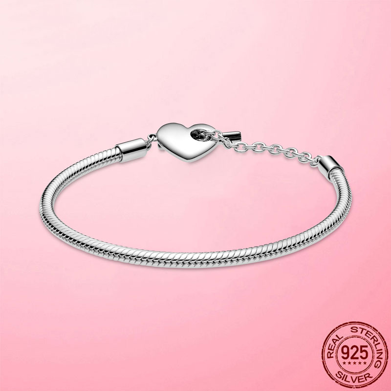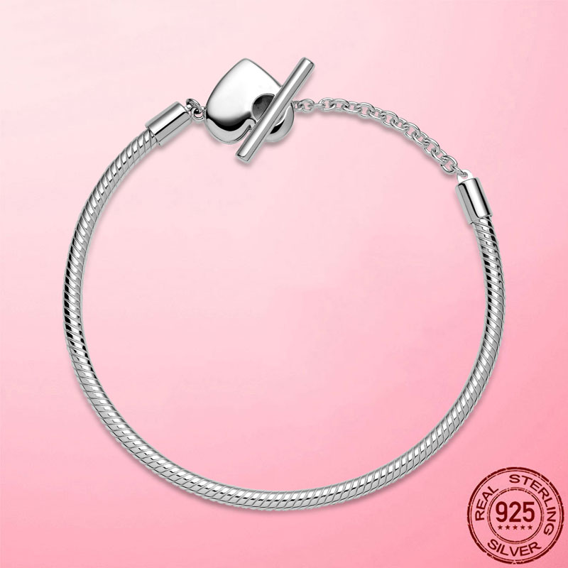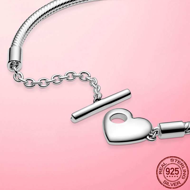 Femme Bracelet 925 Silver Moments Heart T-Bar Snake Chain Bracelet Bangle for Women Fine Women Jewelry Gift Pulseira