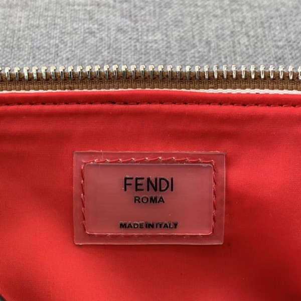 Small belt bag with zip fastening. Front zip pocket and internal mesh pocket. Adjustable belt. Made of jacquard fabric with iconic brown Pequin striped motif. Fendi Label appliqué in printed leather with gold lettering. Palladium-finish metalware.