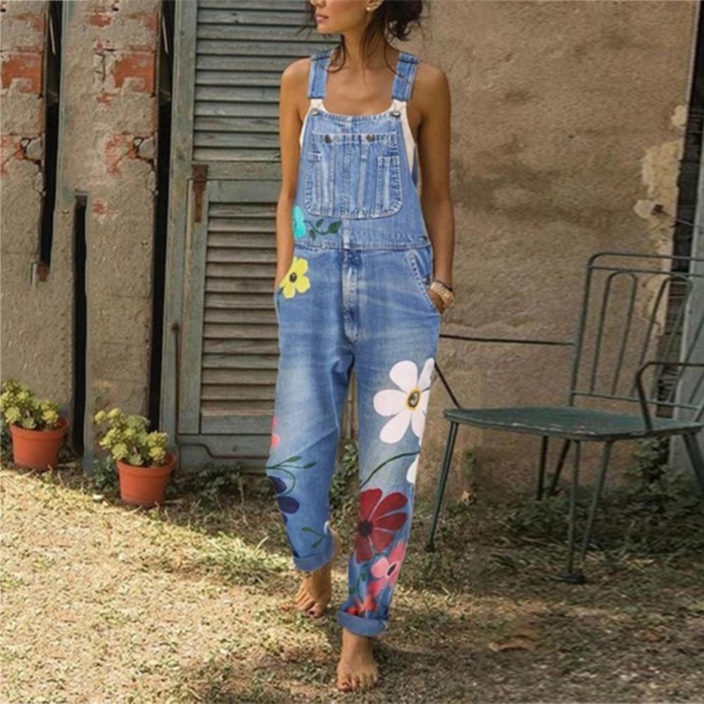 Floral Print Loose Danim Overalls for Women Summer Blue Denim Overalls Jumpsuit Rompers Femme Ninth Pants Female Pants