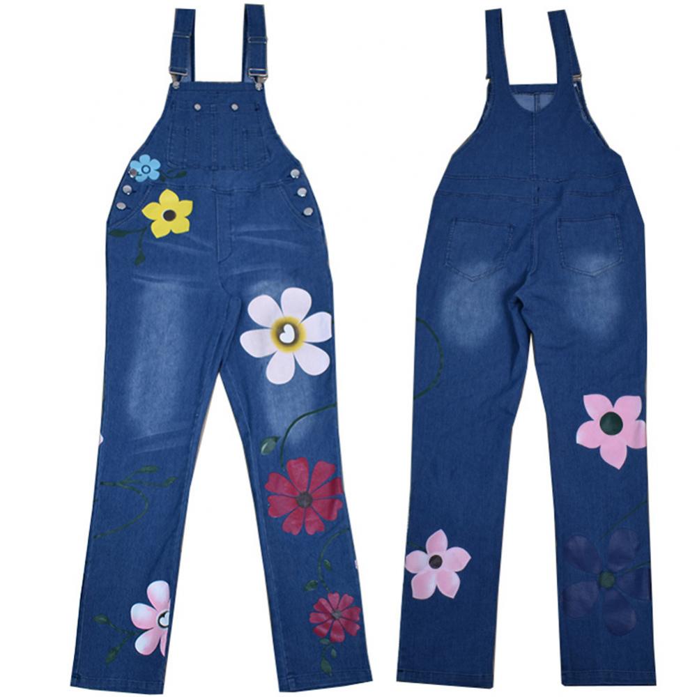 Women Floral Print Pockets Washable Denim Overall Jumpsuit Suspender Trousers