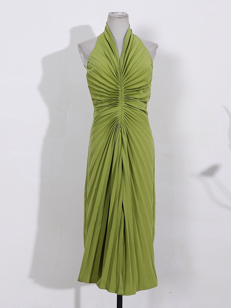 GVUW Pleated V-neck Split Skinny Dress Women Elegant Sleeveless Solid Color Summer Female Wedding Party Clothing 17D1301