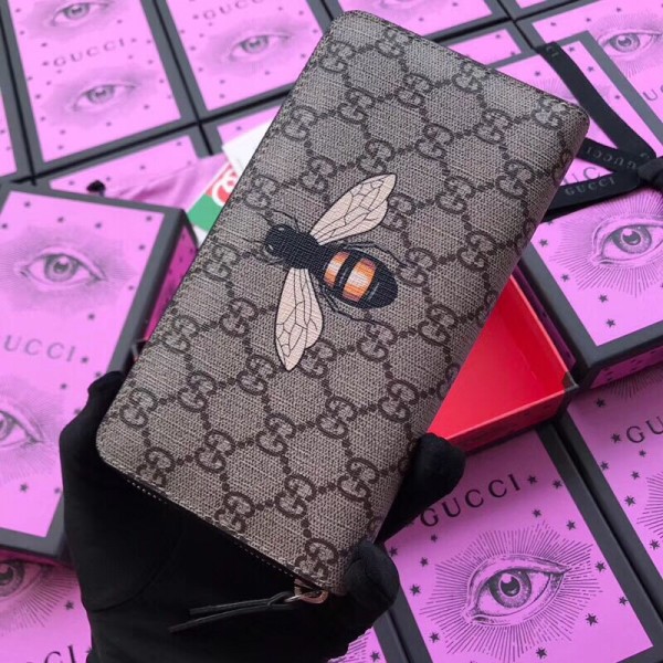 The bee-a symbol first seen in Gucci ready-to-wear in the 1970s-was taken from the archives and reintroduced in the Fall Winter 2015 collection. Here, it is printed at the center of a zip around wallet made in GG Supreme canvas, a material with low environmental impact.