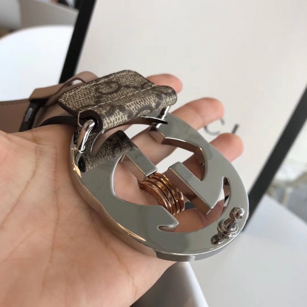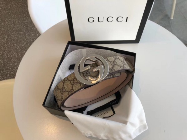 This belt from Gucci is made from their signature GG Supreme canvas. The belt is presented in a beige and ebony toned colourway and is contrasted by a silver-tone metal buckle in the form of two interlocking G’s. The belt has a pin fastening for an easily adjustable fit and is finished with a brown leather loop.