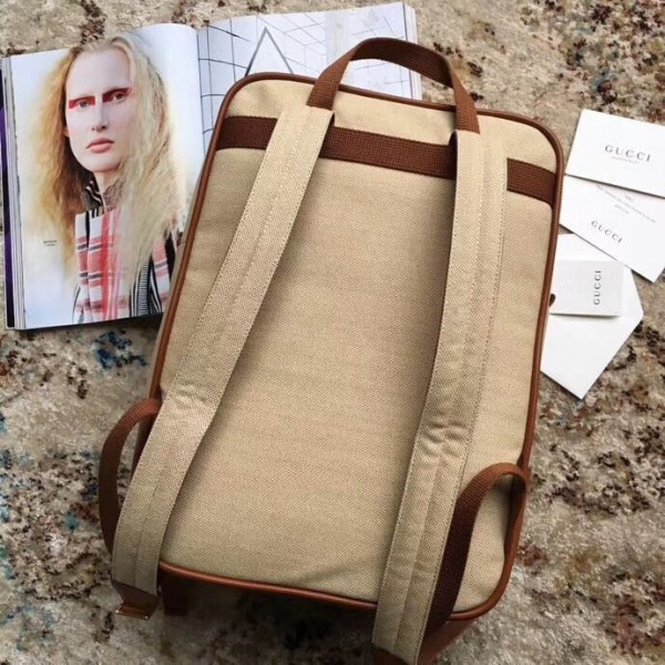 The classic backpack shape blends vintage appeal with traditional House codes in a softly structured shape. The distinctive Web is presented against beige canvas—a bi-colour woven fabric with a slight aged effect that enhances a vintage appearance. The rectangular shape is trimmed with leather and a small Interlocking G in gold-toned metal. New shapes and signature Gucci lines are reimagined in a mix of fabrics and trims imbued with an inherently summer feel.