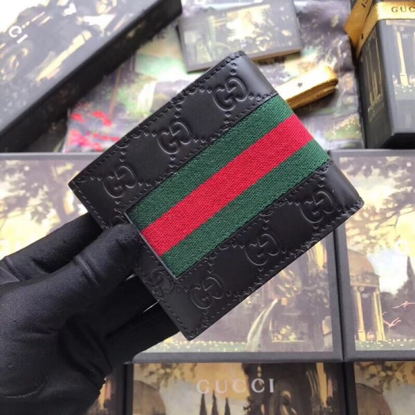 A combination of two of Gucci’s most recognizable icons: the GG motif and the Web. This bi-fold wallet is made in heat debossed Gucci Signature with Gucci Web stripe detail.