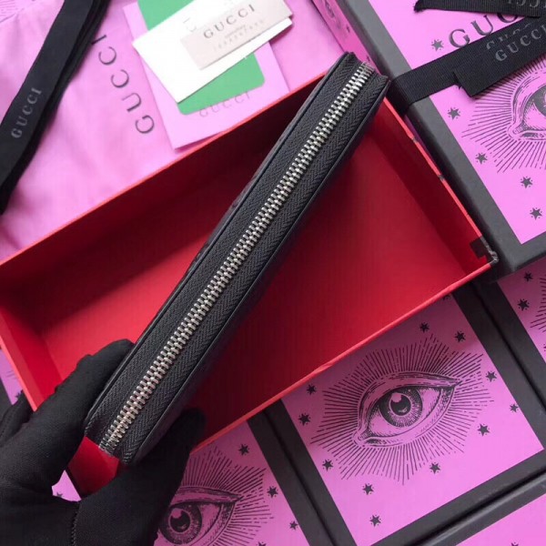 A combination of two of Gucci’s most recognizable codes: the GG motif and the Web. This zip around wallet is made in heat debossed Gucci Signature with Gucci Web stripe detail.