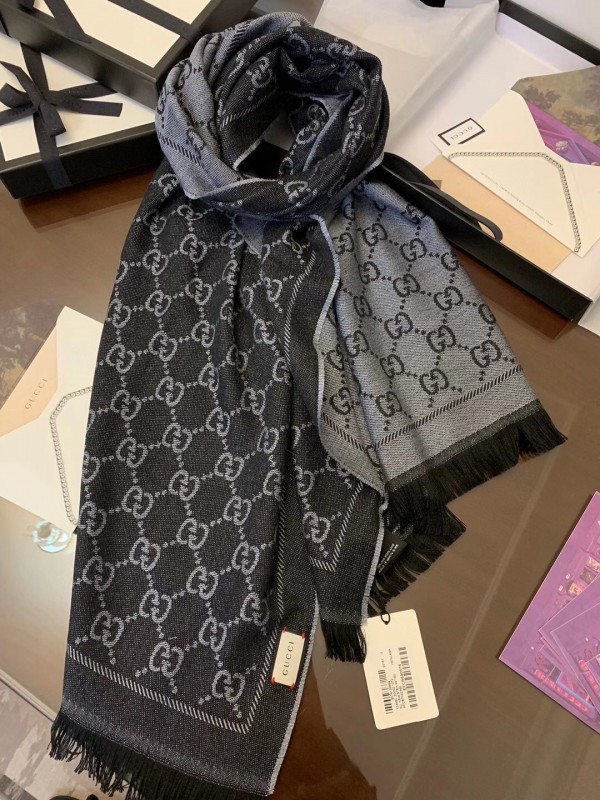 Refined with fringe edges, this double jacquard wool scarf features the House’s trademark GG pattern, first introduced in the ’70s. The combination of black and grey shades makes this a stylish and versatile accessory for every day.