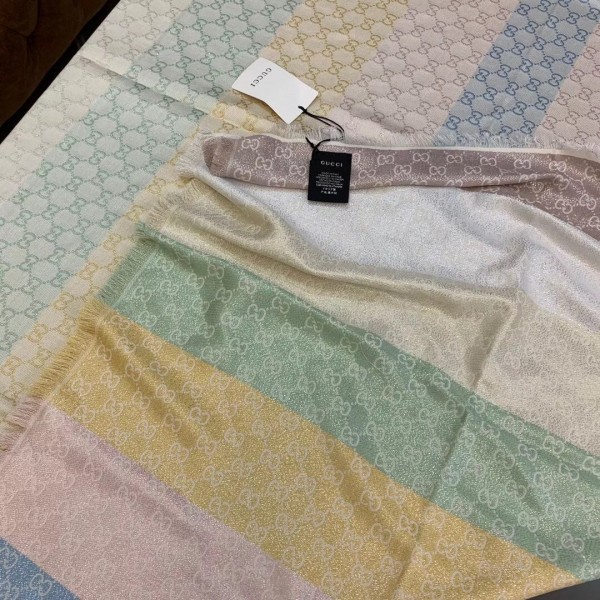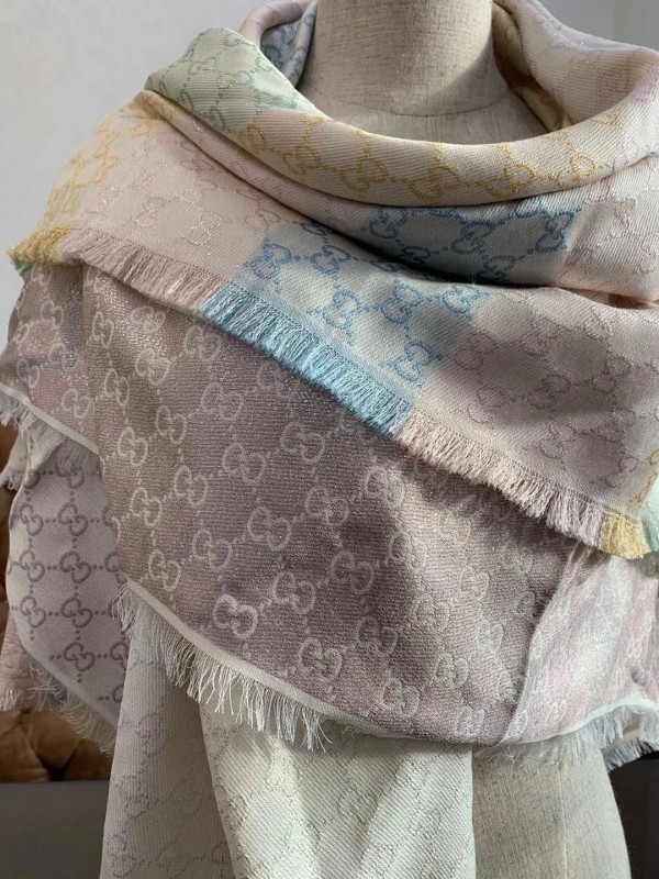 An evolution of the original Gucci rhombi design, the GG logo has become an established symbol of Gucci’s heritage. Integrated within the Cruise 2019 collection, the distinctive pattern is reimagined in combination with a multicolored pastel pattern. It is crafted from a blend of viscose, cotton, silk and wool for an accessory that feels supremely soft to the touch and is lightweight to wear.