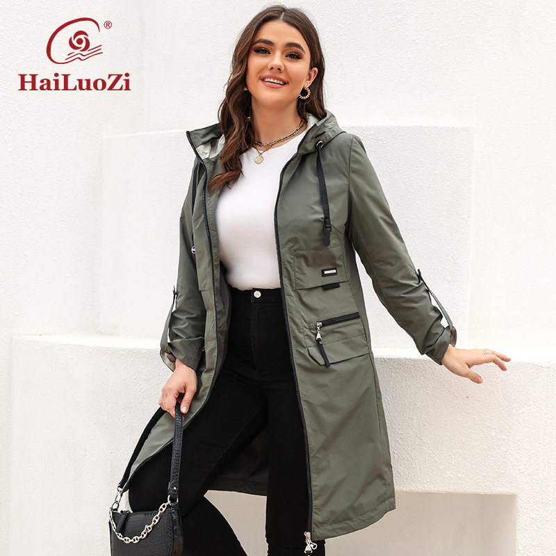HaiLuoZi Spring Autumn Hood Zipper Windbreaker Women's Mid-Length Trench Coat Plus Size Female Big Pockets Outerwear 9663