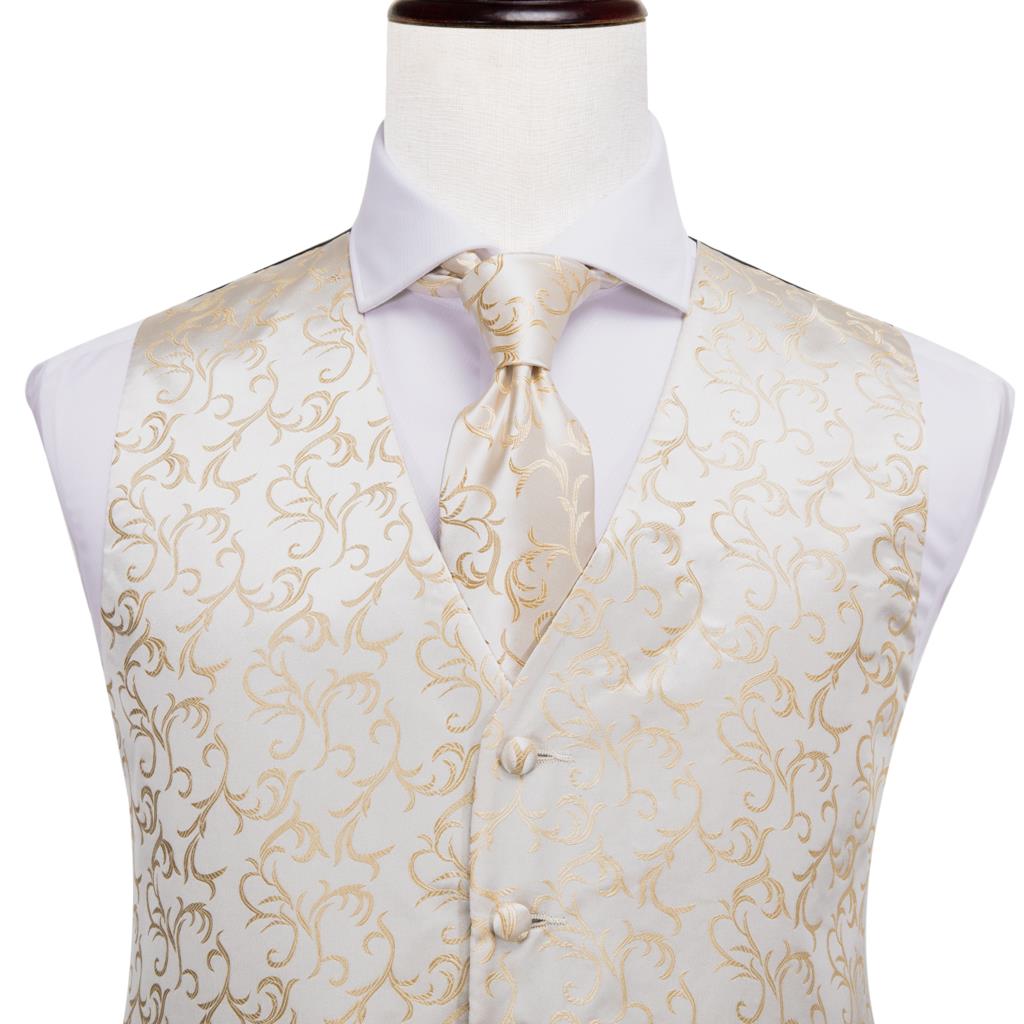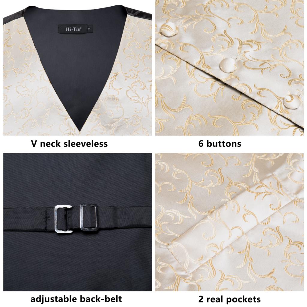 Hi-Tie Silk Ivory Beige Champagne Gold Mens Vests Tie Hankerchief Cufflinks Set Jacquard Vine Waistcoat for Men Suit Dress
