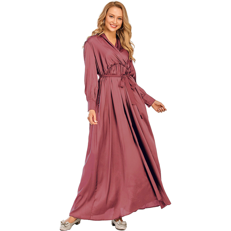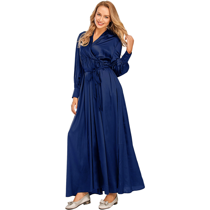 Jilbab Muslim Dress Arab Ladies Summer and Autumn V-neck Lace up Long-sleeved Dress Elegant Style Abaya Islamic Dubai Dress