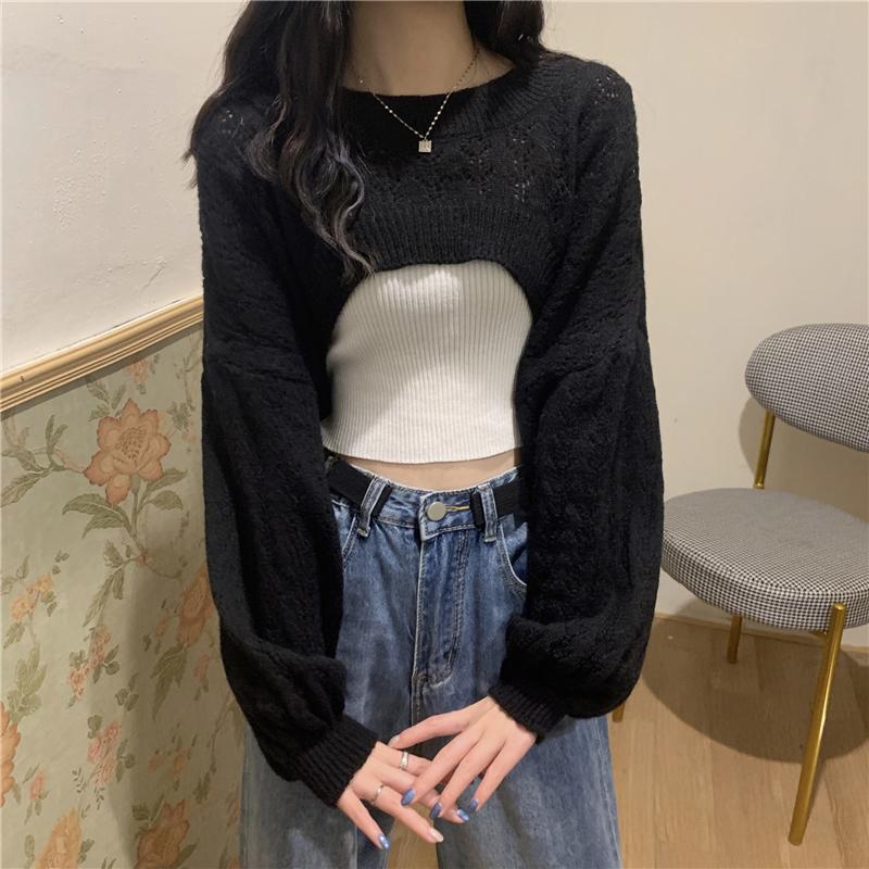 Knitted Shrugs Women Solid Loose Crop Top Hollow Out Designer Hipster New-arrival Soft Teenagers Full Sleeve All-match Ulzzang