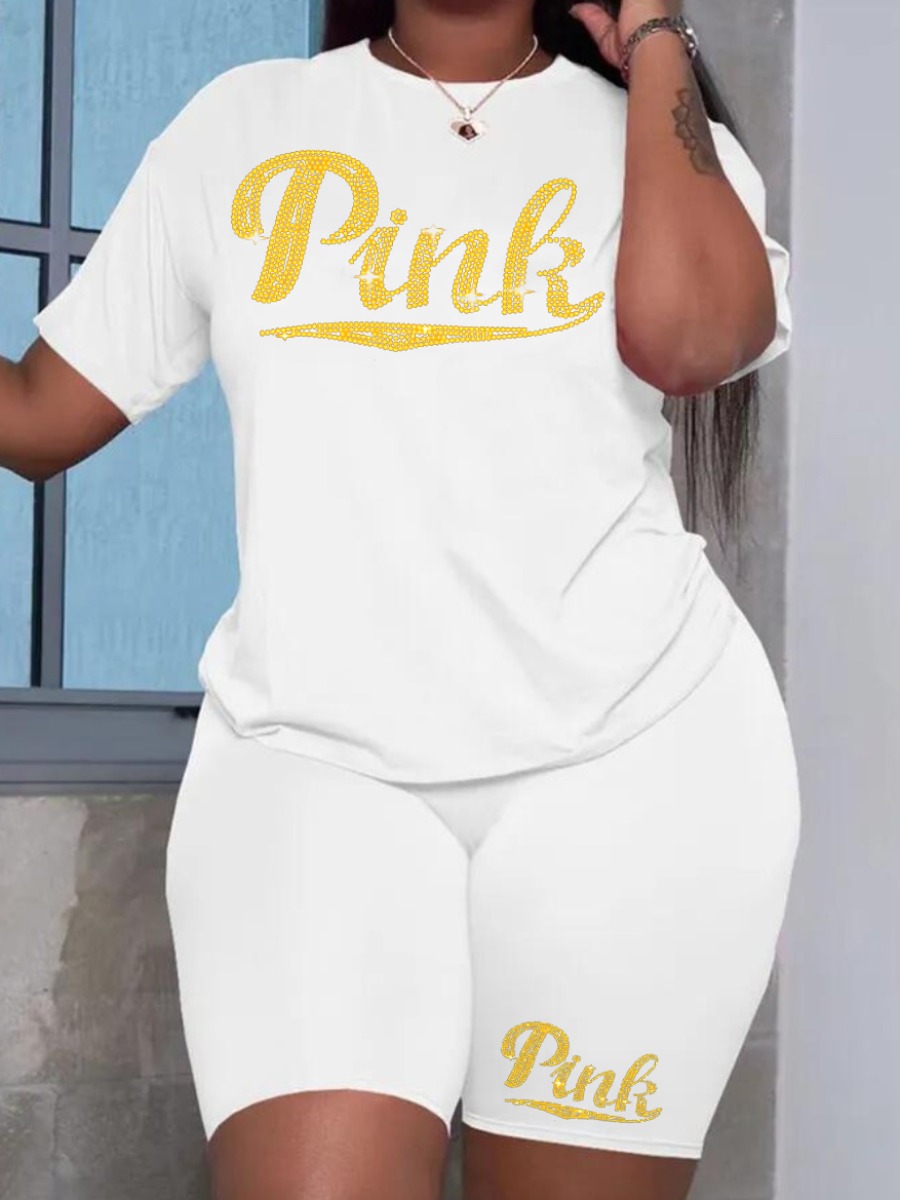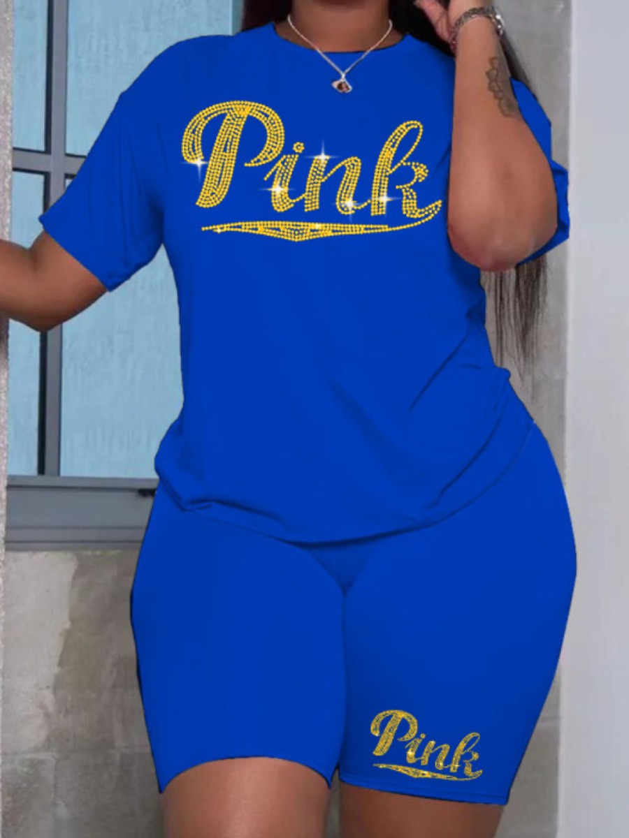 LW Plus Size Shorts Set F Rhinestone Letter Female Polyester Casual Regular Sleeve O Neck Matching Outfits Pink Summer Clothings