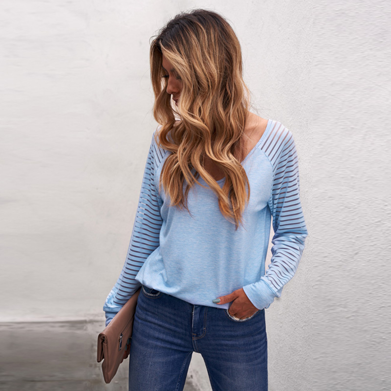 Ladies Slim White Black V-Neck Top Tulle Stripe Fall Pullover Free Mail Promotion