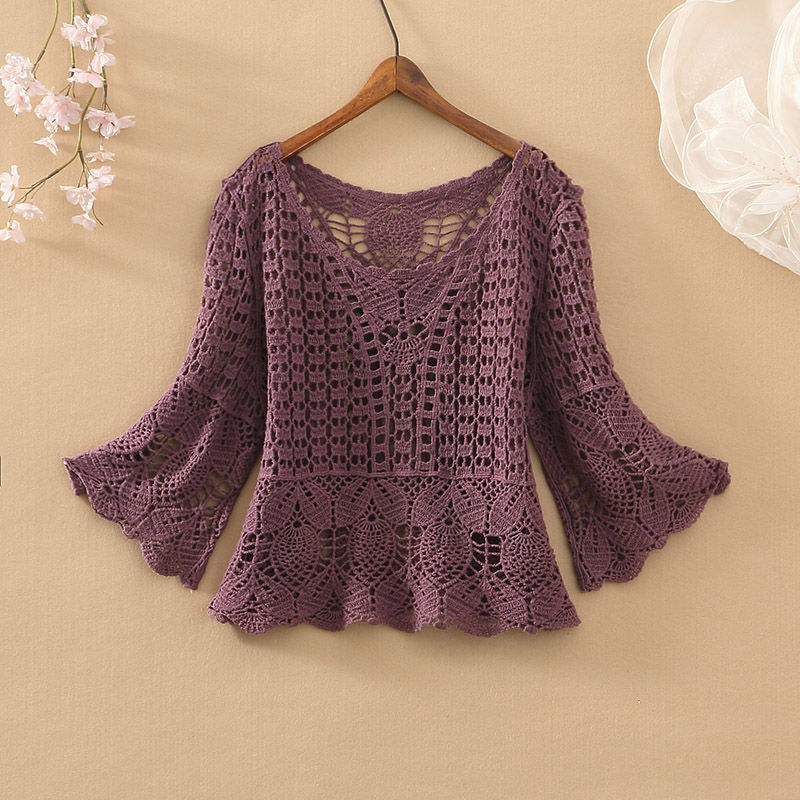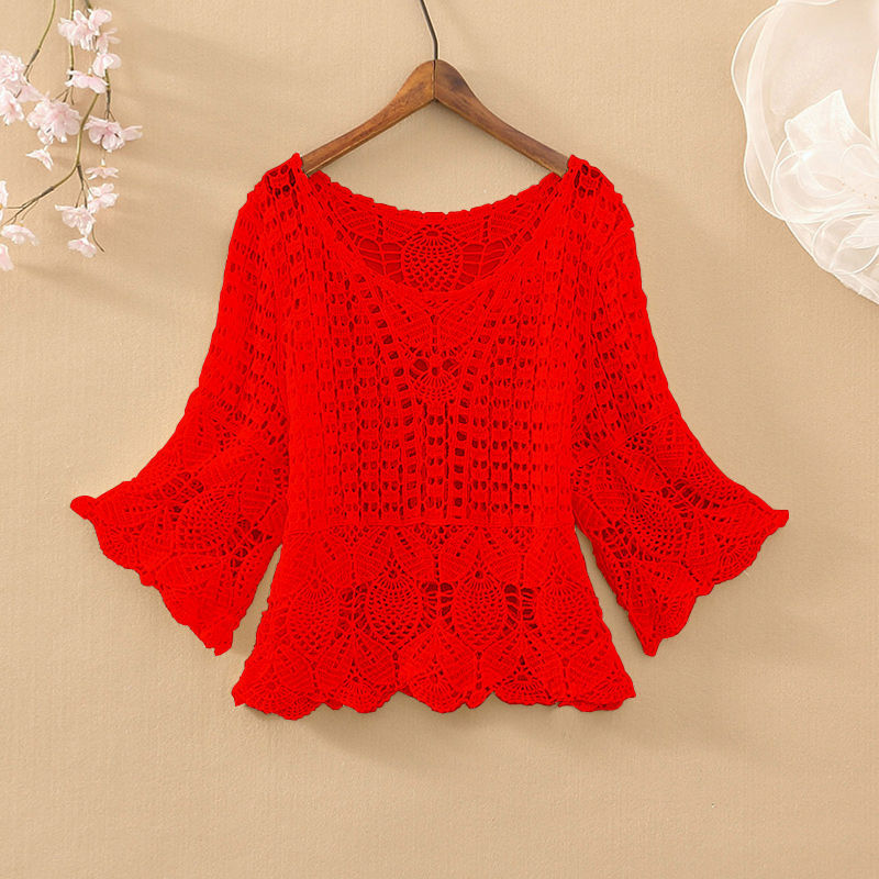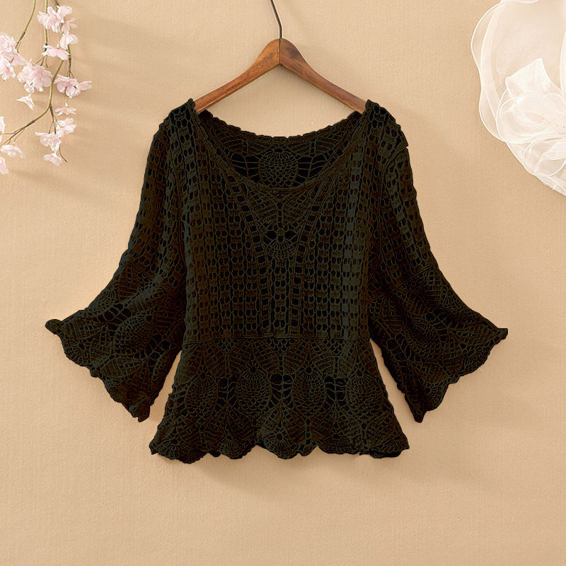 Lady Spring Summer Loose Five-point Sleeve Short Round Neck Solid Color Plaid Casual Female Hollow Out Lace Top