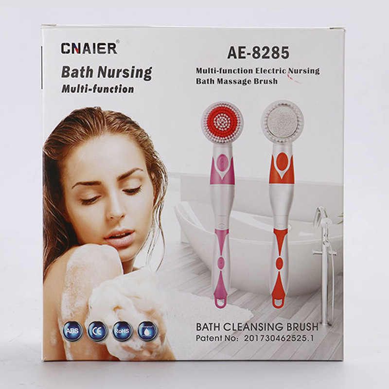 Note: The electric bath brush is composed of a brush head, a handle and a battery cover. It has the functions of rotating the brush with fast, medium and slow motor oscillation, pushing the brush up and down, and replacing the brush head. Purpose. The utility model has reasonable design, simple structure and integrated multi-function, which can not only help people to clean their backs, but also the vibration and massage functions of the motor can eliminate the fatigue of the human body, so that one can enjoy a comfortable bathing pleasure