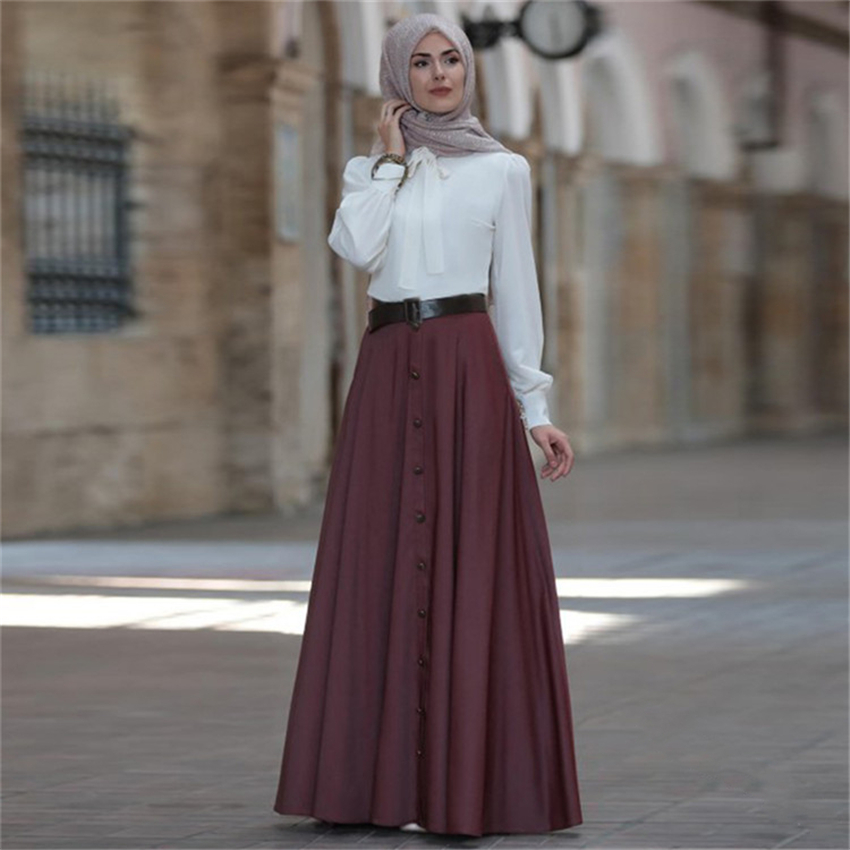 Muslim Elegant Skirt Islamic Dubai A-Line Pleated Turkish Solid Half Dress Hight Waist Big Swing Buttons Party Wear