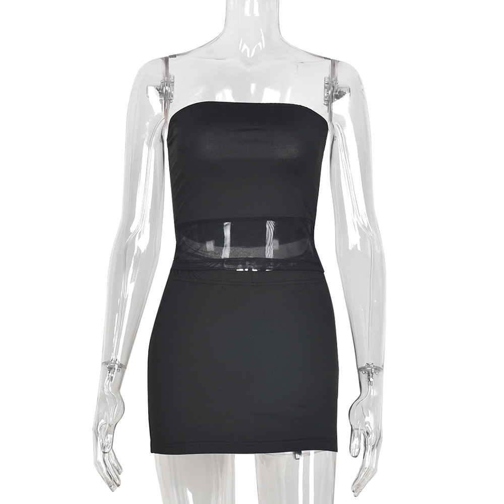NEONBABIPINK Sexy Women Clothing 2 Pieces Set Summer Dress Bodycon Set Black Mesh Patchwork Tube Top and Mini Skirts N82-BZ15