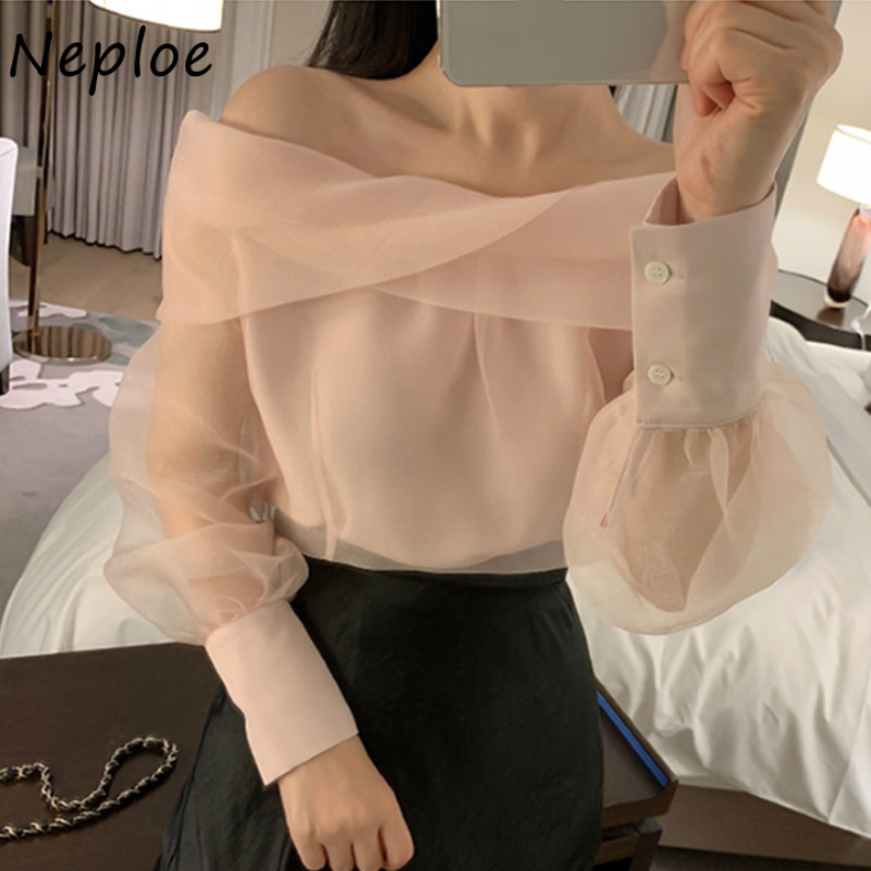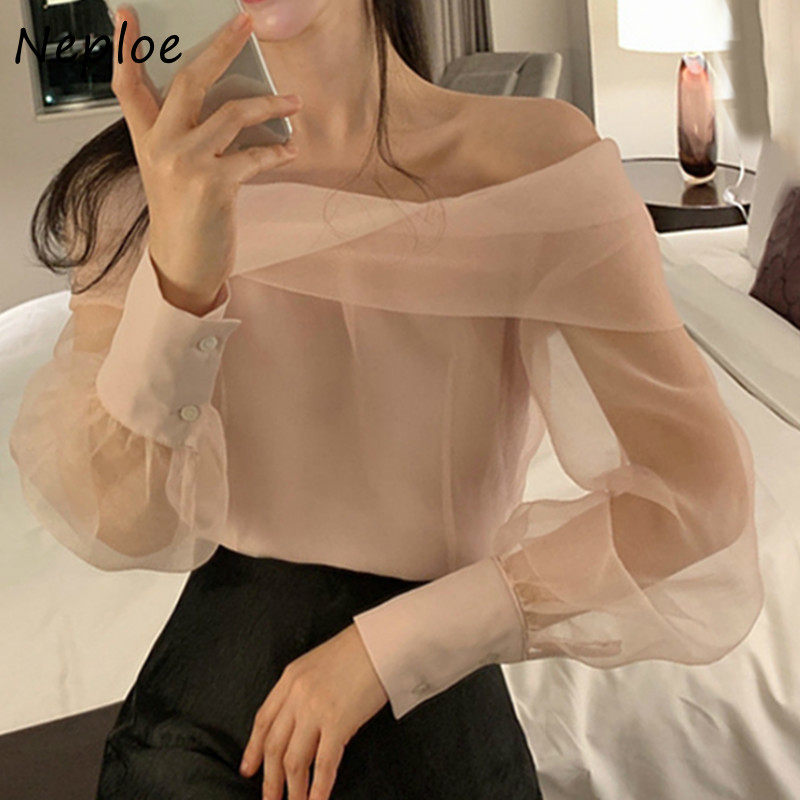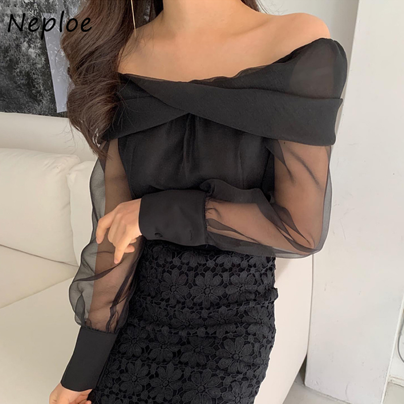 Neploe Slash Neck Shoulder Strapless Mesh Blouse Women Spring Pullover Long Sleeve Blusas Solid Slim Fit Wild Shirt