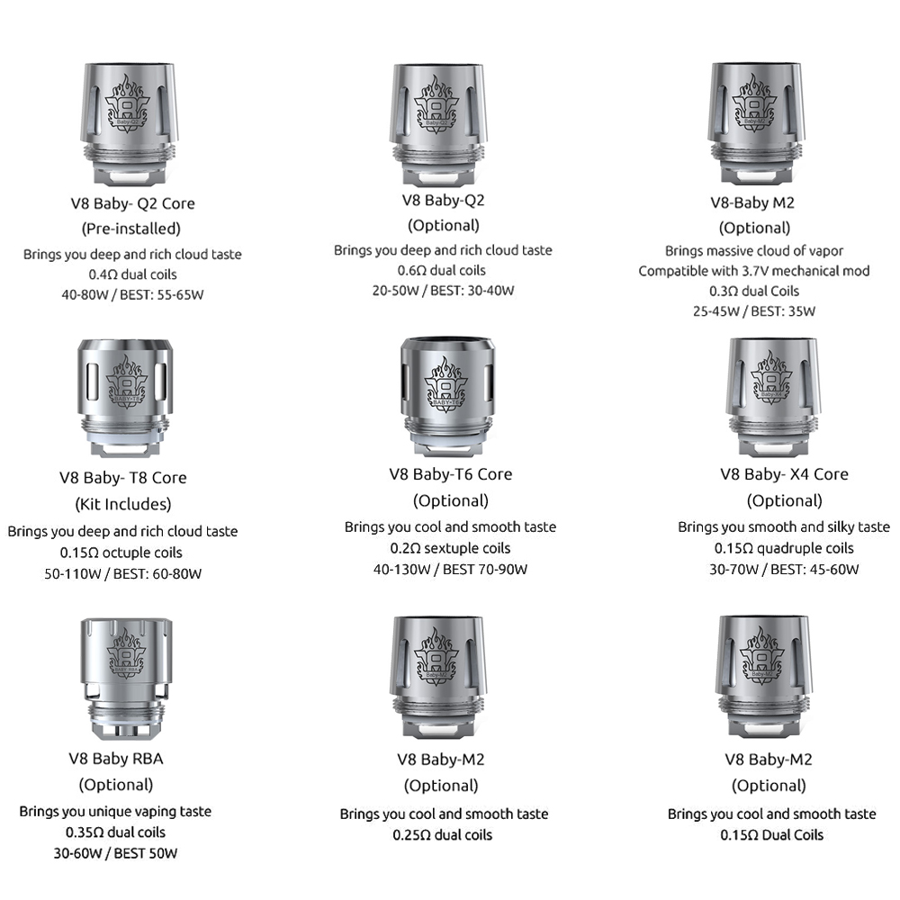 Coil Optional V8 Baby Q2: Dual coils, 0.4ohm (40-80W / Best 55-65W), 0.6ohm (20-50W / Best 30-40W)