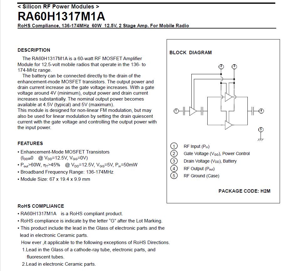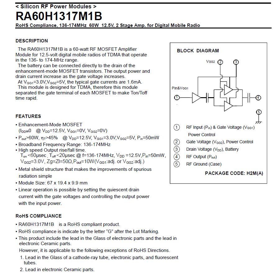 The RA60H1317M1B is a 60-watt RF MOSFET Amplifier