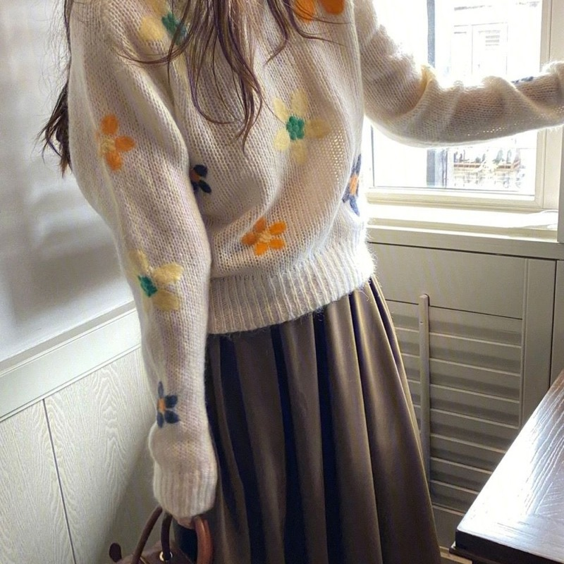 Round Neck Printed Pullover Sweater Western Style Loose Spring and Autumn All-match Long-sleeved Knitted Top Women