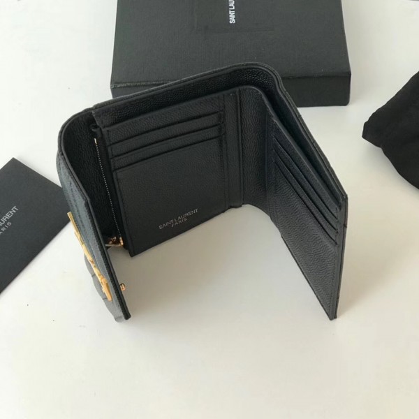 The Compact Tri Fold wallet looks chic in grain de poudre embossed leather, which is finished with interlaced YSL metal initials. Small enough to fit into even a tiny bag or clutch, yet with space for coins, notes and credit cards, this neat wallet is the ultimate mini companion.