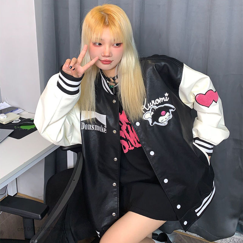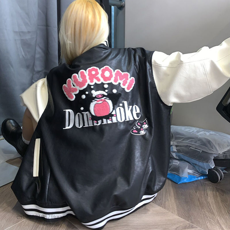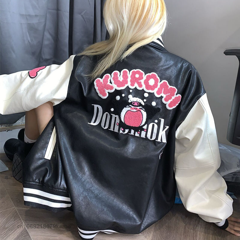 Sanrio Clothes Cartoon Kuromi Leather Coat High Baseball Jacket Autumn Women Embroidered Jacket Y2k Couples Tops