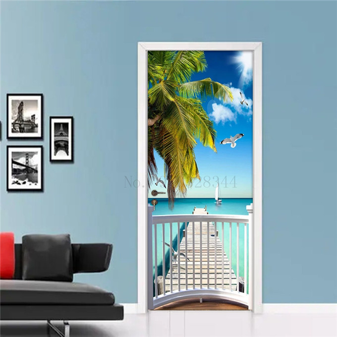 Seascape Beach Door Stickers Bedroom Bathroom Living Room 3d Decoration Wallpaper Self-adhesive Vinyl Poster Window Glass Mural