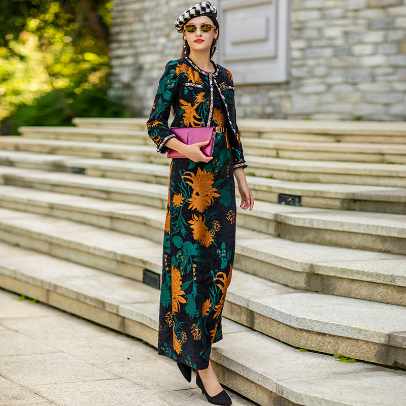 Spring Autumn Beading Suit Dress Women 2 Piece Set Blazer Women Straight Jacquard Dress for Women Suits Indie Folk