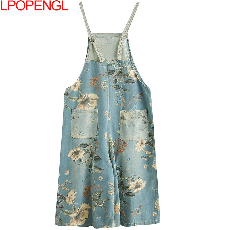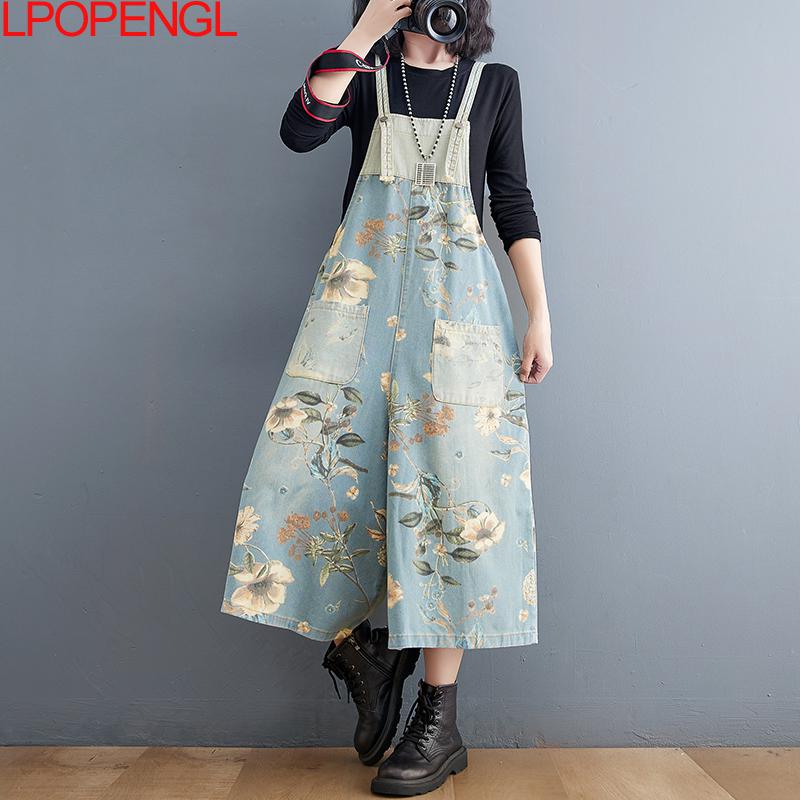 Summer Vintage Floral Jumpsuits Women Wide Leg Pants Suspenders Strap Pockets Denim Overalls Rompers Washed Jeans Playsuits
