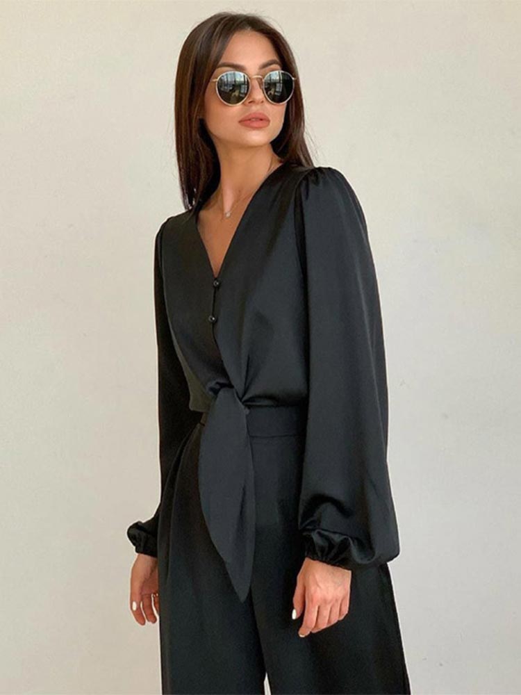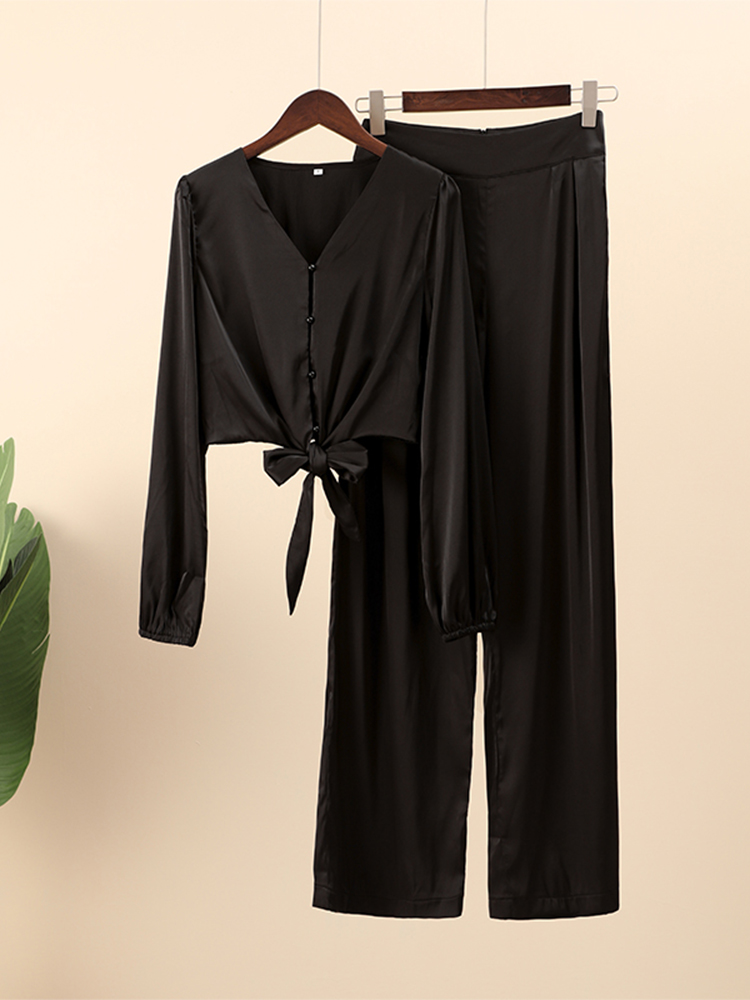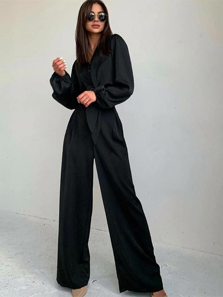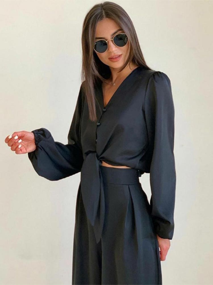 Summer Women Black Satin Pant Suits V-Neck Long Sleeve Blouse Matching Wide Trousers Suit Casual Slim Two Piece Set