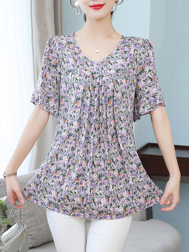 Summer Women's Tops Short Sleeved Ladies Blouse V-Neck Large Size Loose Top Chiffon Shirt Folds Casual Print Blouses Blusas