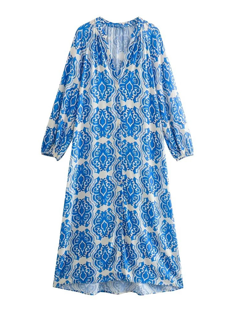 TRAF Women Front Buttons Printed Midi Dress Vintage V Neck Long Lantern Sleeve Female Dresses Vestidos Mujer