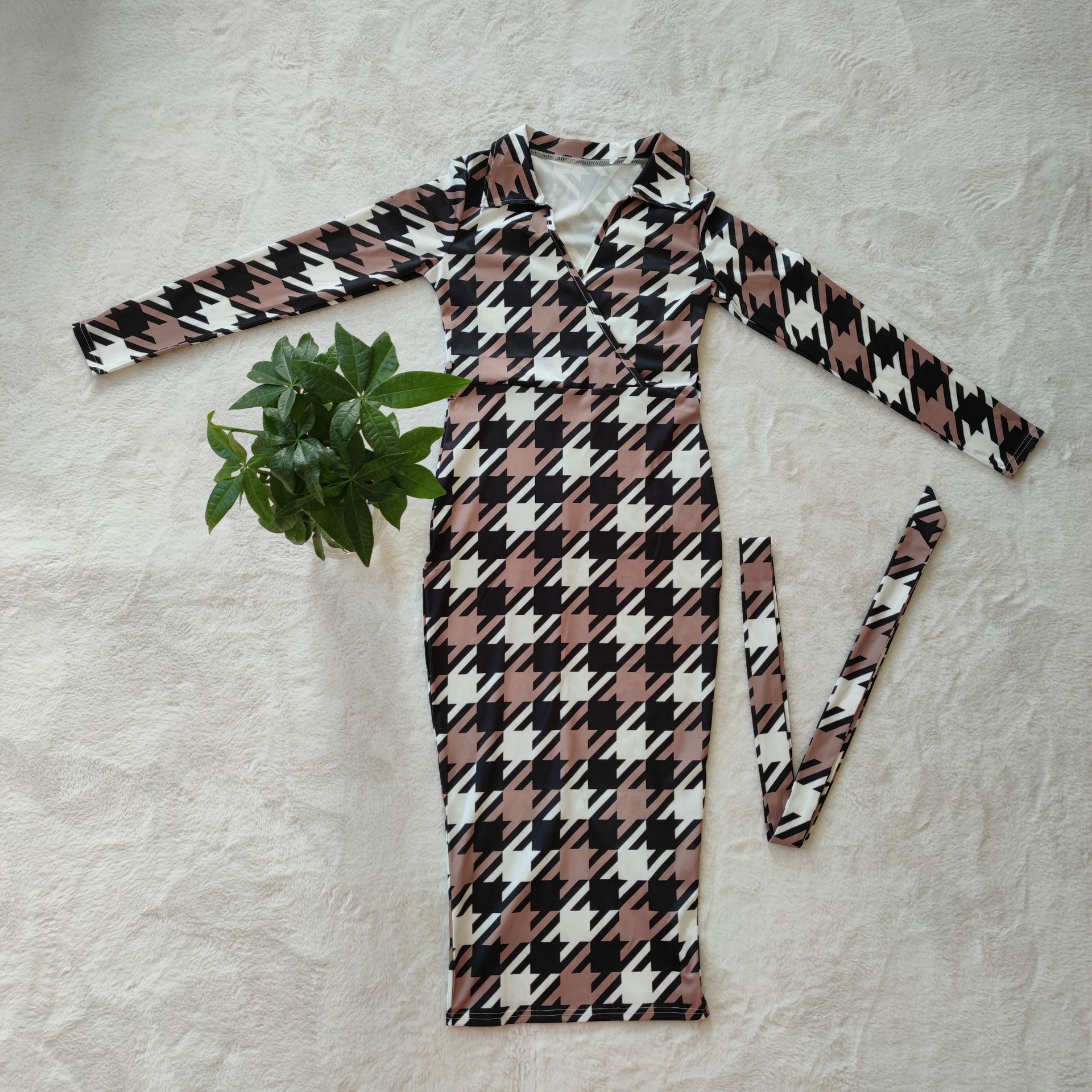 UFOA Ladies Casual Fall Print Grid Commuter Sexy V-neck Long Sleeves Retro Hip Bag Long Dress