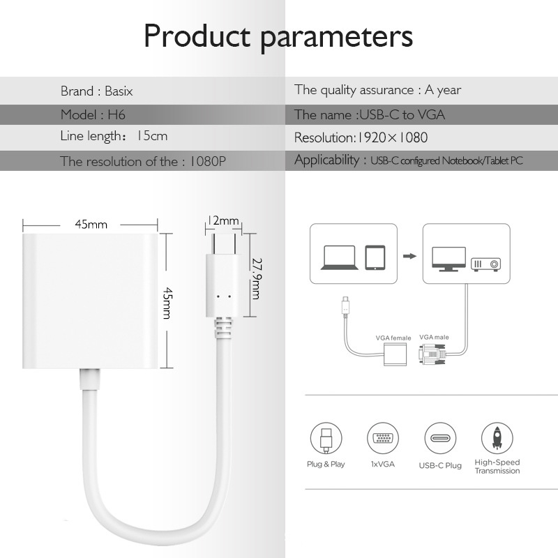 USB C To VGA Adapter:This USB C to VGA Adapter enables you to connect a USB C computer or phone to an VGA-equipped display,monitor,HDTV,projector.It's design for office, conference, home-theater entertainment .