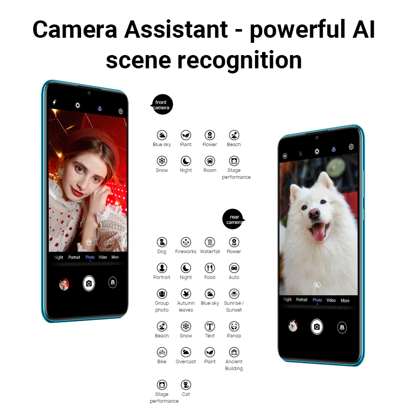 Shooting Modes: Portrait, Panorama, AR lens, Time-Lapse, Filter, 3D Panorama, Stickers, Capture smiles, Mirror reflection, Audio control, Timer.