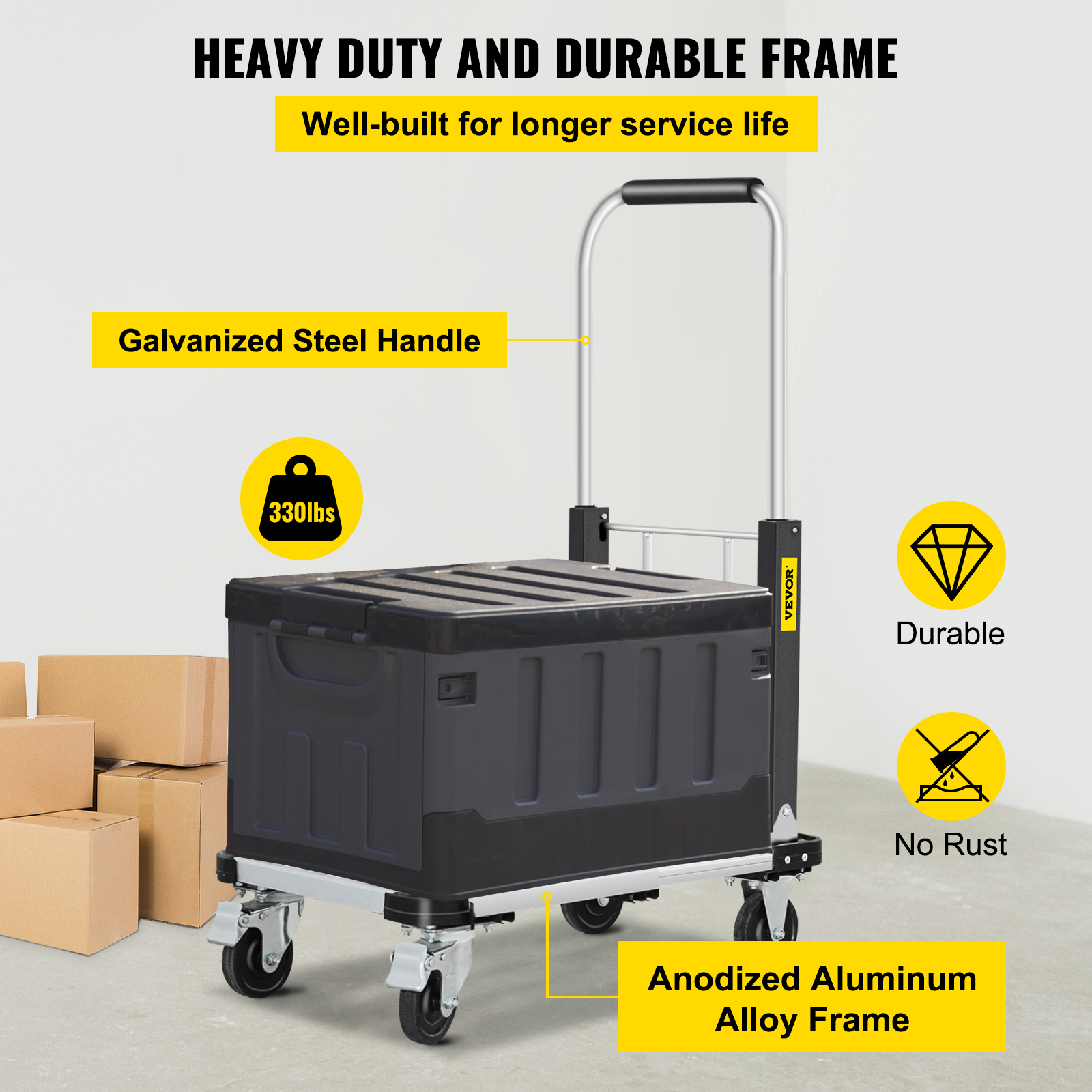 This foldable push cart features a custom thickened baseplate, stainless steel handle, and sturdy construction that can carry up to 330 lbs. (Note: To ensure stability, please place the cargo in the middle of the frame)