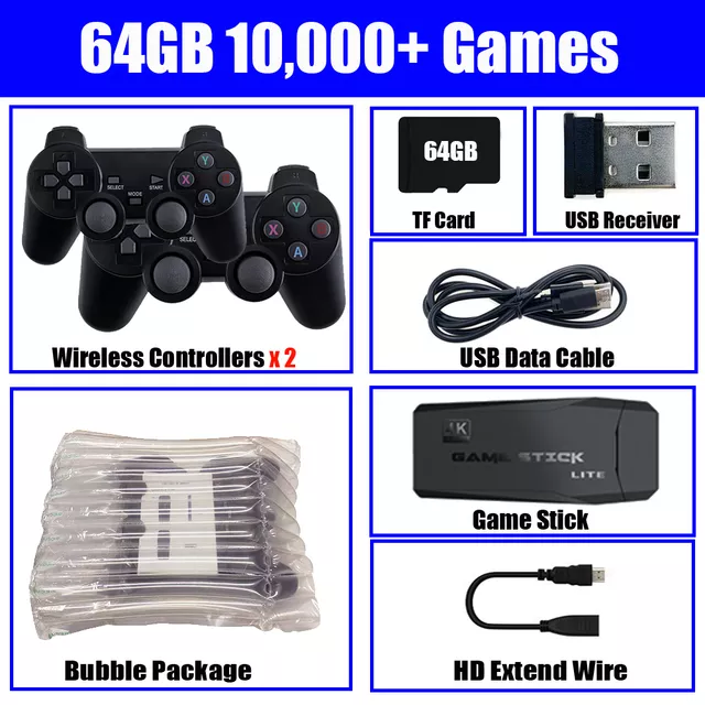 Package List : 1x Game Console, 2x Wireless Gamepads ,1x USB Receiver ,1x Power Cord ,1x HD-Compatible Extension Cable