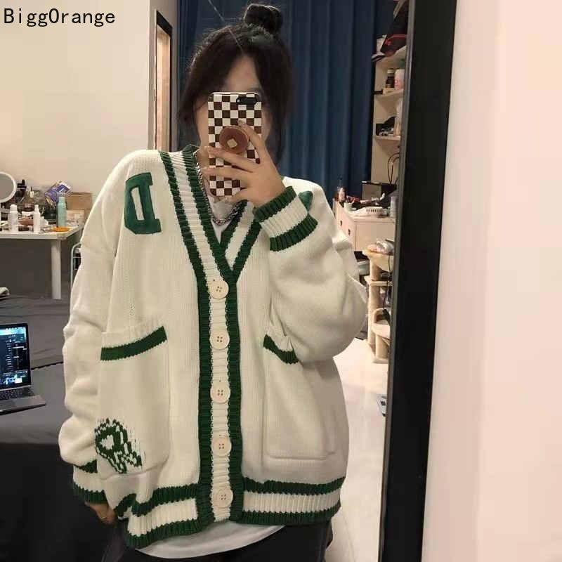 Vintage letter embroidery V-neck cardigan sweater women autumn and winter college style loose all-match knitted cardigan sweater