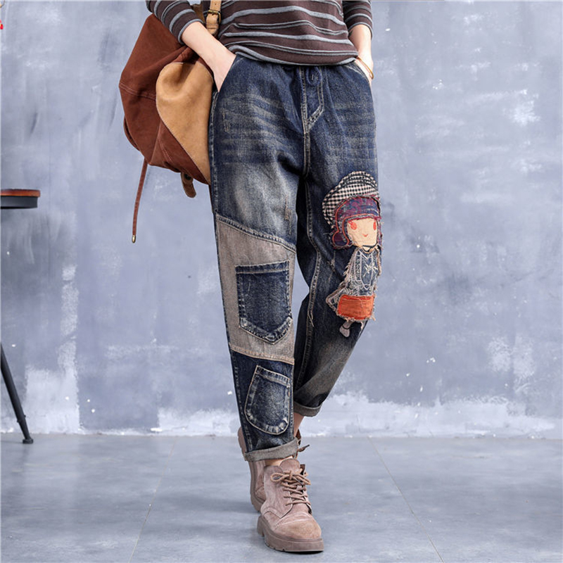 Vintage printing Embroidery Jeans Women Casual Loose plus size Harem pants Denim cottons Do old Jeans Autumn Bottoms