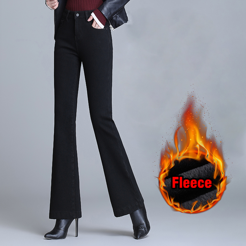 Winter Fleece Flared Pants Jeans Women High Waist Stretch Slim TWide Legs Hick Velvet Female Denim Trousers