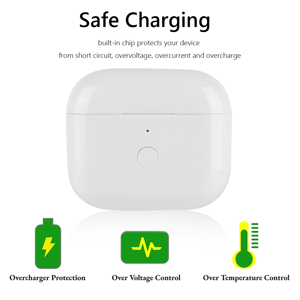 600mAh Earphones Charging Box for AirPods 3 2021 Earbuds Wireless Bluetooth-compatible Headphones Replacement Charging Case Accessories Feature: New upgrade: Perfect for AirPods 3, the battery indicator LED light makes the battery status visible in real time. High-quality replacement: 600mAh built-in battery capacity, a full charge in the charging case is enough to charge for AirPods 3 3-4 times. Charging and Pairing: With a responsive Bluetooth-compatible button. Not only can it charge the earphones, but it can also pair the earphones with for iPhone or Android phone. Support wireless charging, support flip pop-up window, support Bluetooth-compatible pairing Precise Design: Ports are easily accessible without removing the case and reserve the location for the charging hole. LED battery indicator can be seen while charging. Provides enough power to your earphones for normal use Portable: The charging case is small and exquisite, with a charging cable, it is convenient to charge in the office, home, car or travel. Lightweight design for easy portability. QUALITY AND SAFETY: Made of eco-friendly ABS, dustproof and scratch-resistant; built-in chip protects your device from short circuit, overvoltage, overcurrent and overcharge
