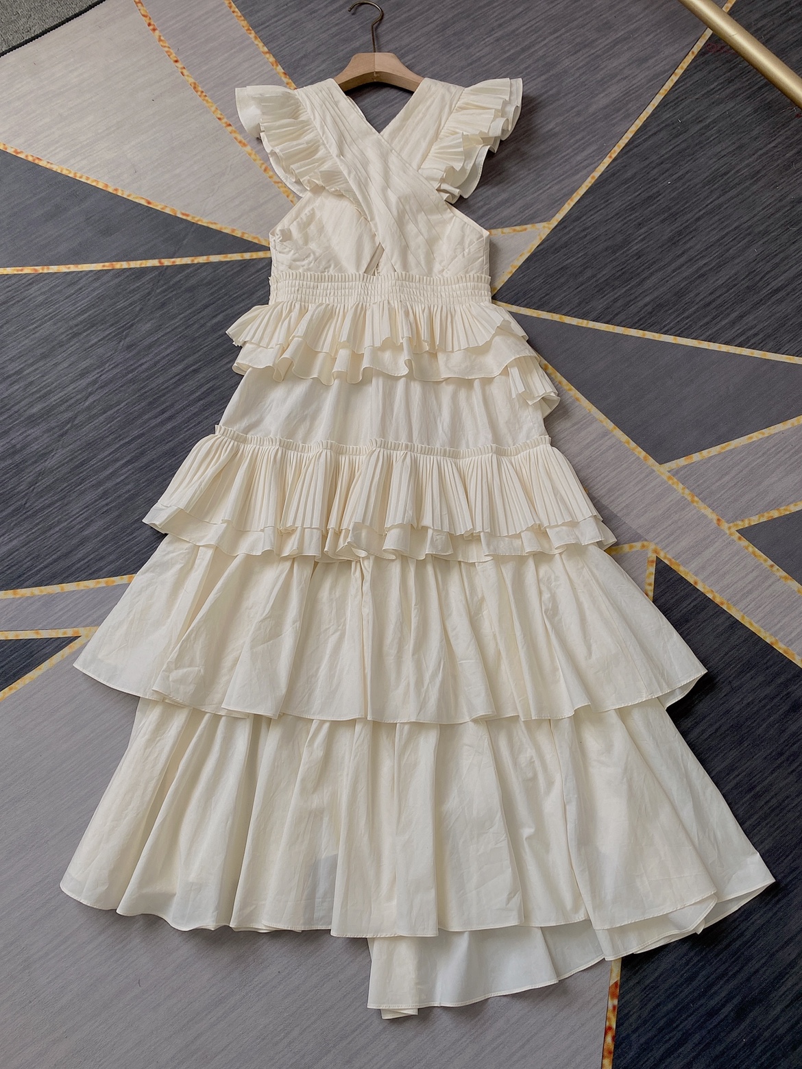 Women Black White Mid-length Dress Sleeveless Ruffle Irregular High Waist Pleated Lady Temperament Robe Party